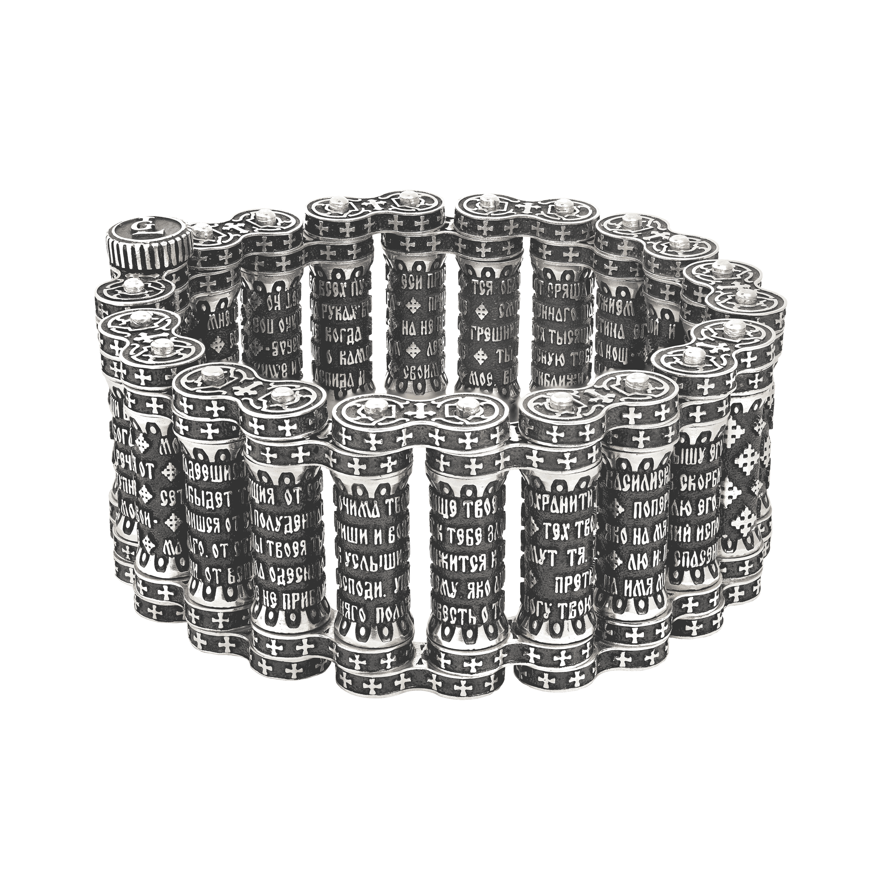 Центральные звенья (цилиндры) браслета обрамляет полный текст 90 ПСАЛМА на церковнославянском языке.