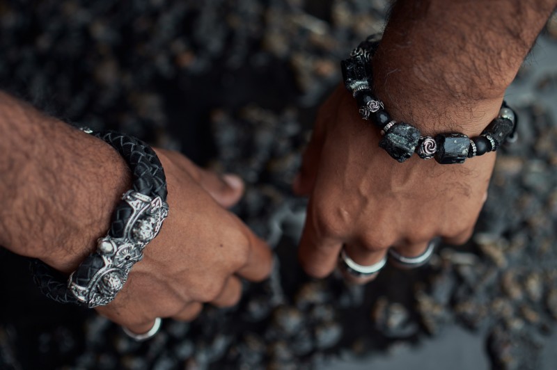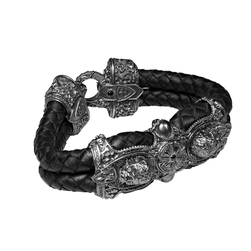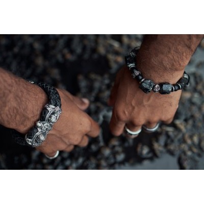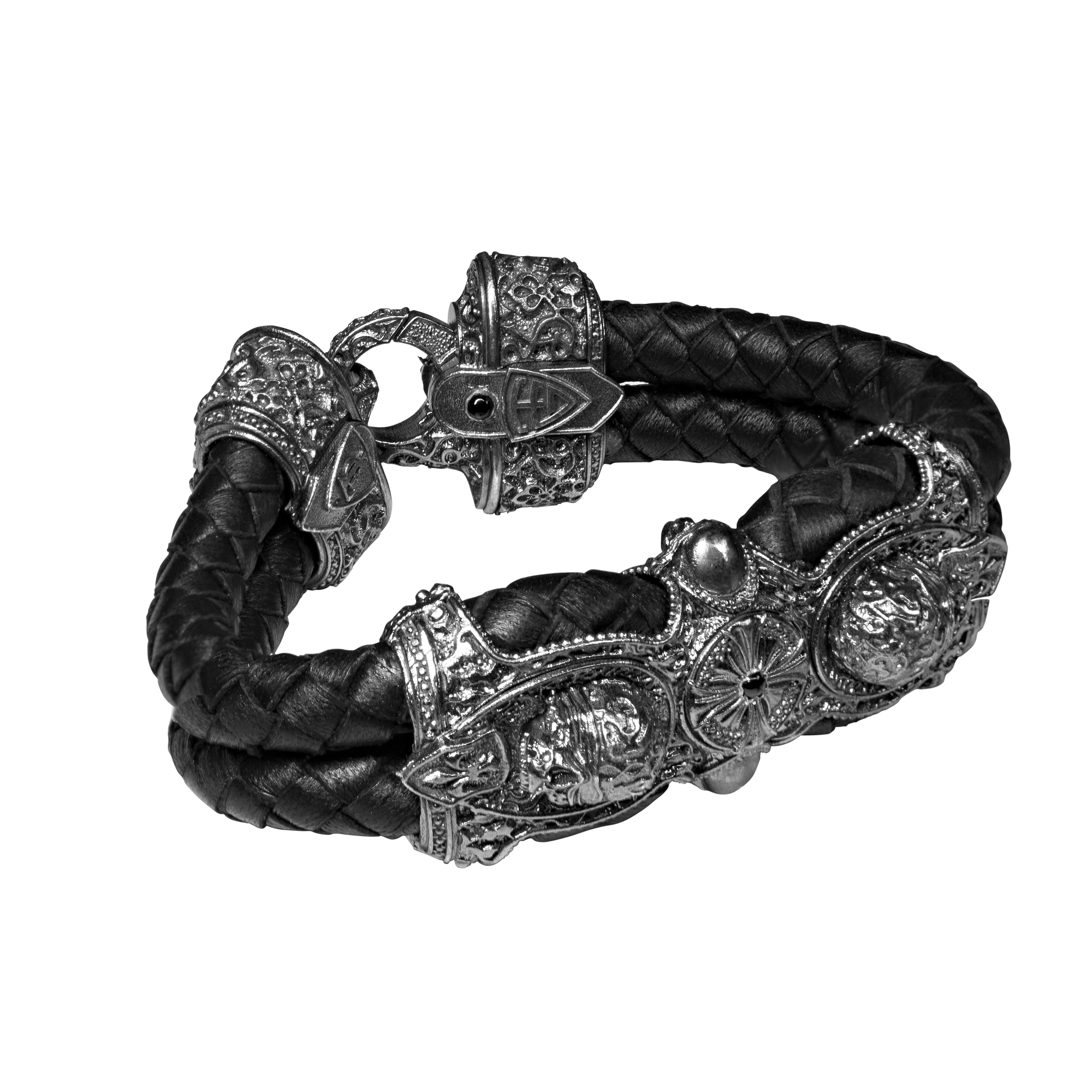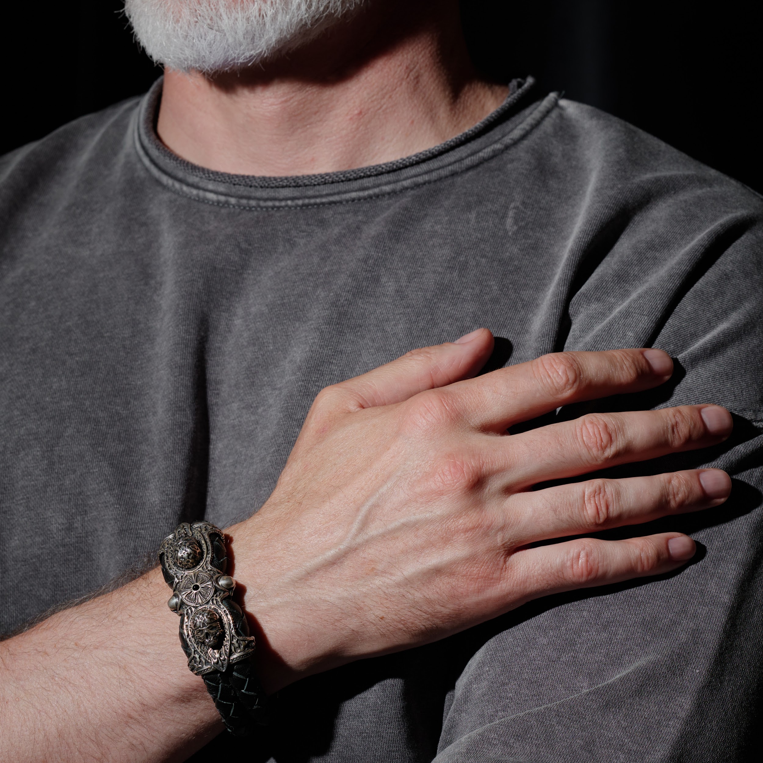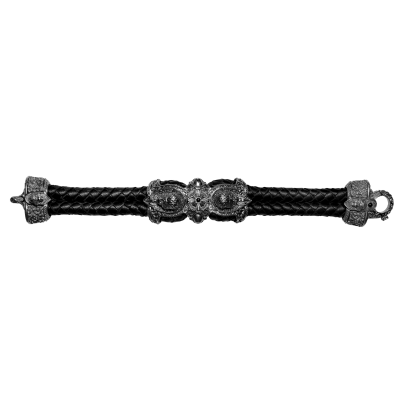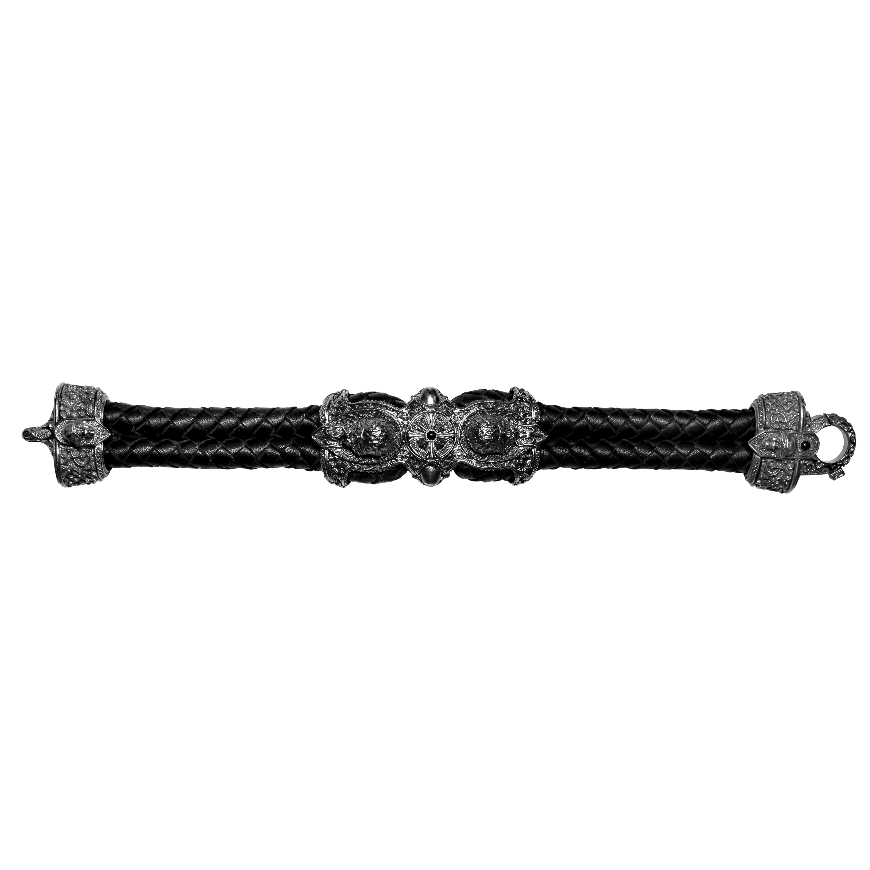Массивный серебряный браслет с черепами на коже ручного плетения