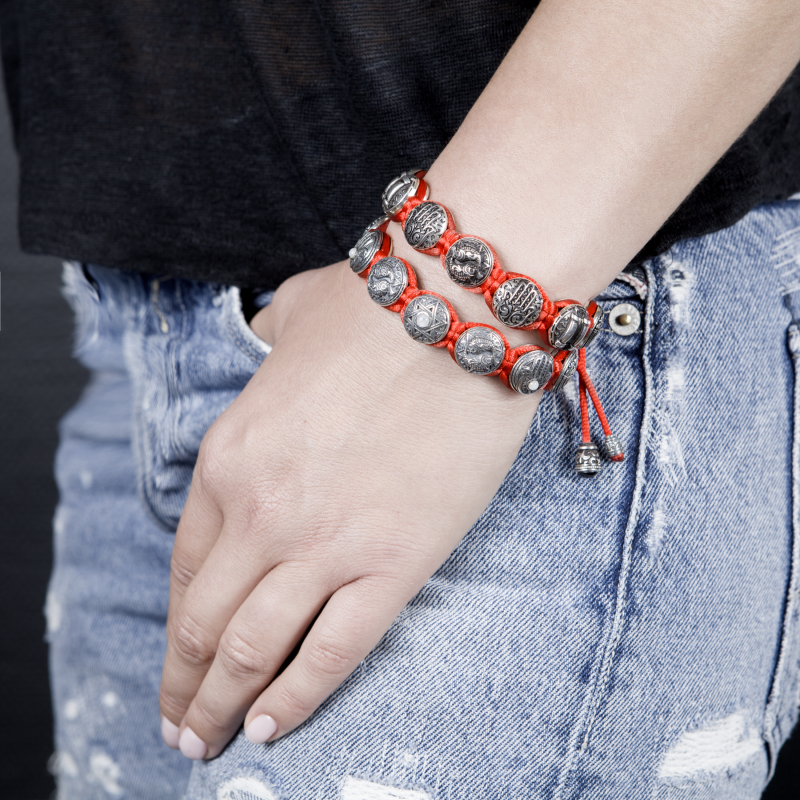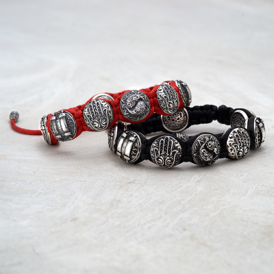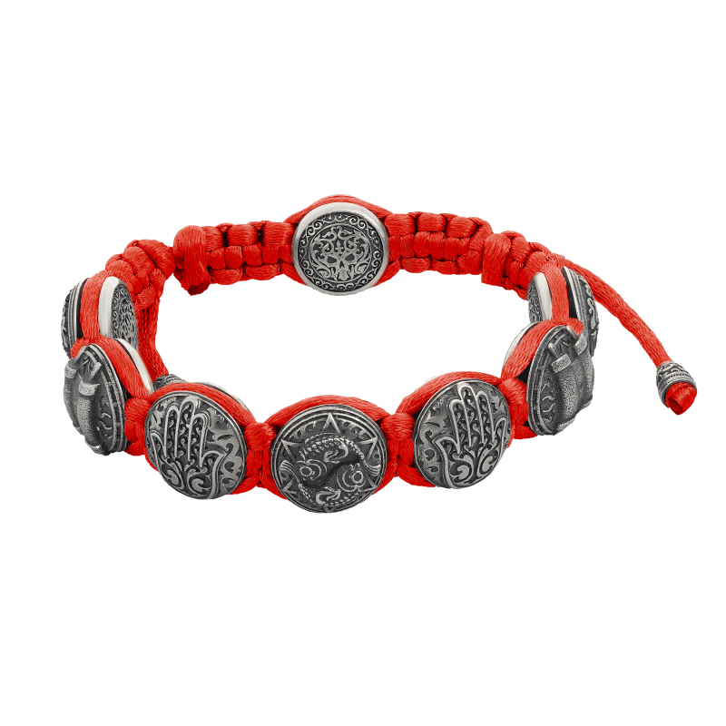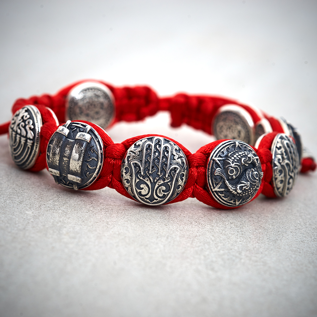 На элементах браслета "В добрый час" - "Be-Shaa Tova" изображены древние символы иудаизма: семисвечник-Менора, свиток Торы, Хамса.