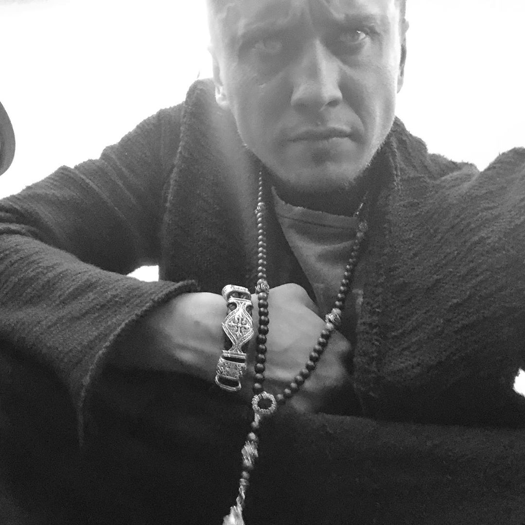 Российский актёр театра и кино, телеведущий, продюсер Павел Прилучный в браслете "Готика" и бидсах "Бог в сердце моём"
